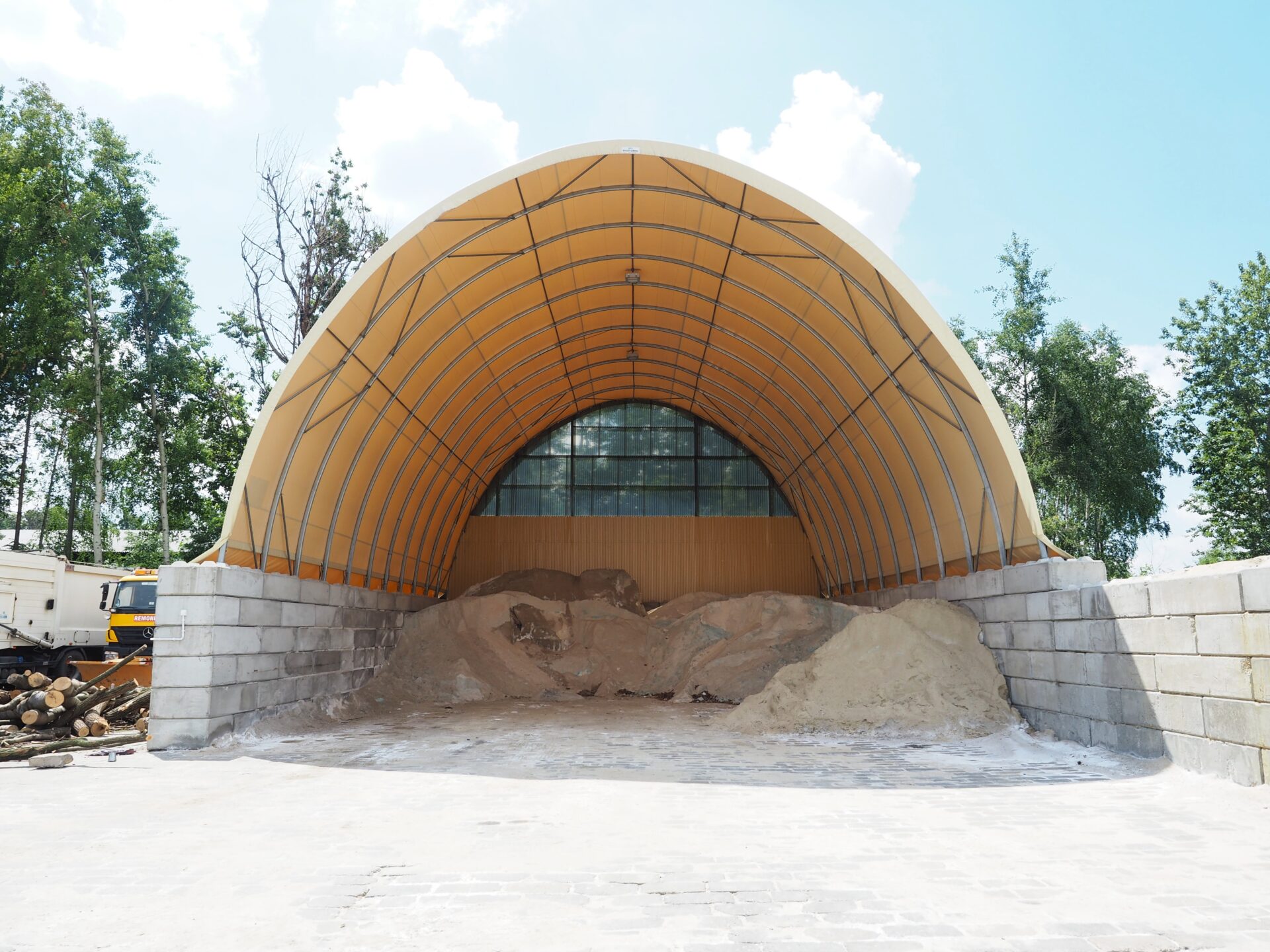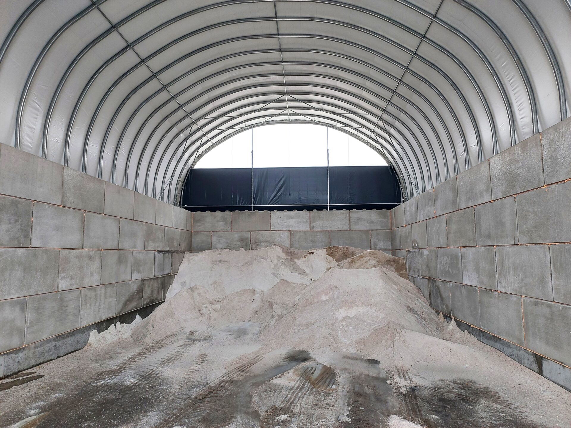 Hale tunelowe od firmy Arbena są projektowane z myślą o trwałej ochronie przechowywanych materiałów. Możliwość zamknięcia szczytów hal oraz zastosowanie siatki przeciwwietrznej zapewnia dodatkowe zabezpieczenie, minimalizując ryzyko wnikania wody i wiatru do wnętrza obiektu. Dzięki temu piasek i sól są w pełni chronione przed wpływem niekorzystnych warunków atmosferycznych, co wydłuża ich okres przechowywania i zachowuje ich jakość.
