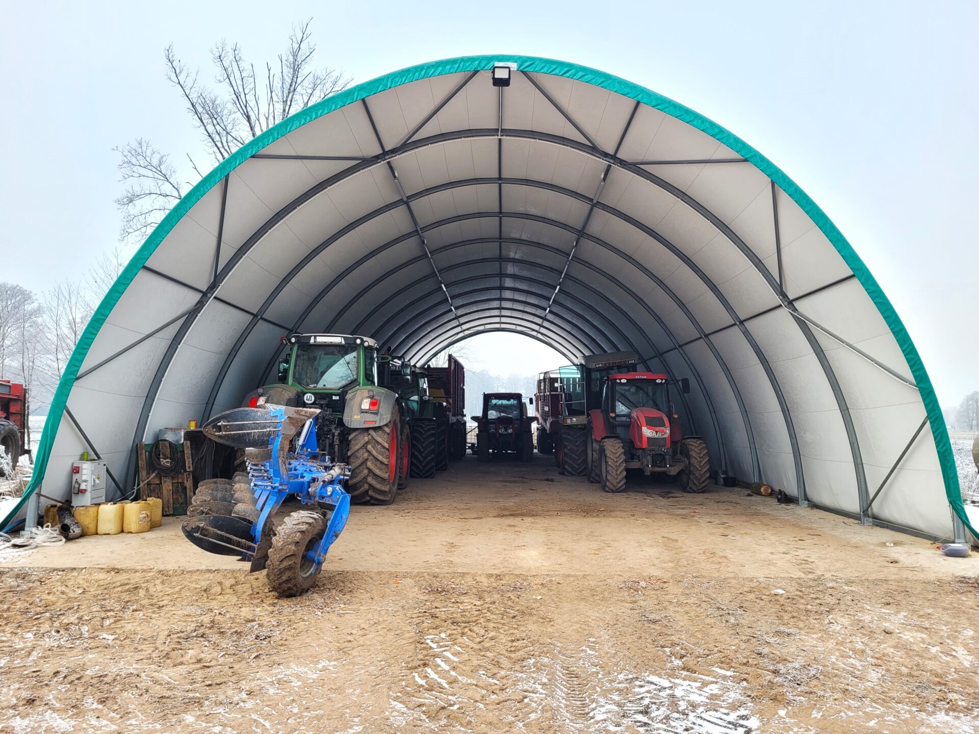 Tym razem przedstawiamy garaż na maszyny rolnicze o następujących parametrach: 12 m szerokości, 30 m długości, 6,45 m wysokości – profil owalny OV130. Hala posadowiona została na wylewce betonowej, końce membrany pokryciowej zostały wpuszczone w grunt.