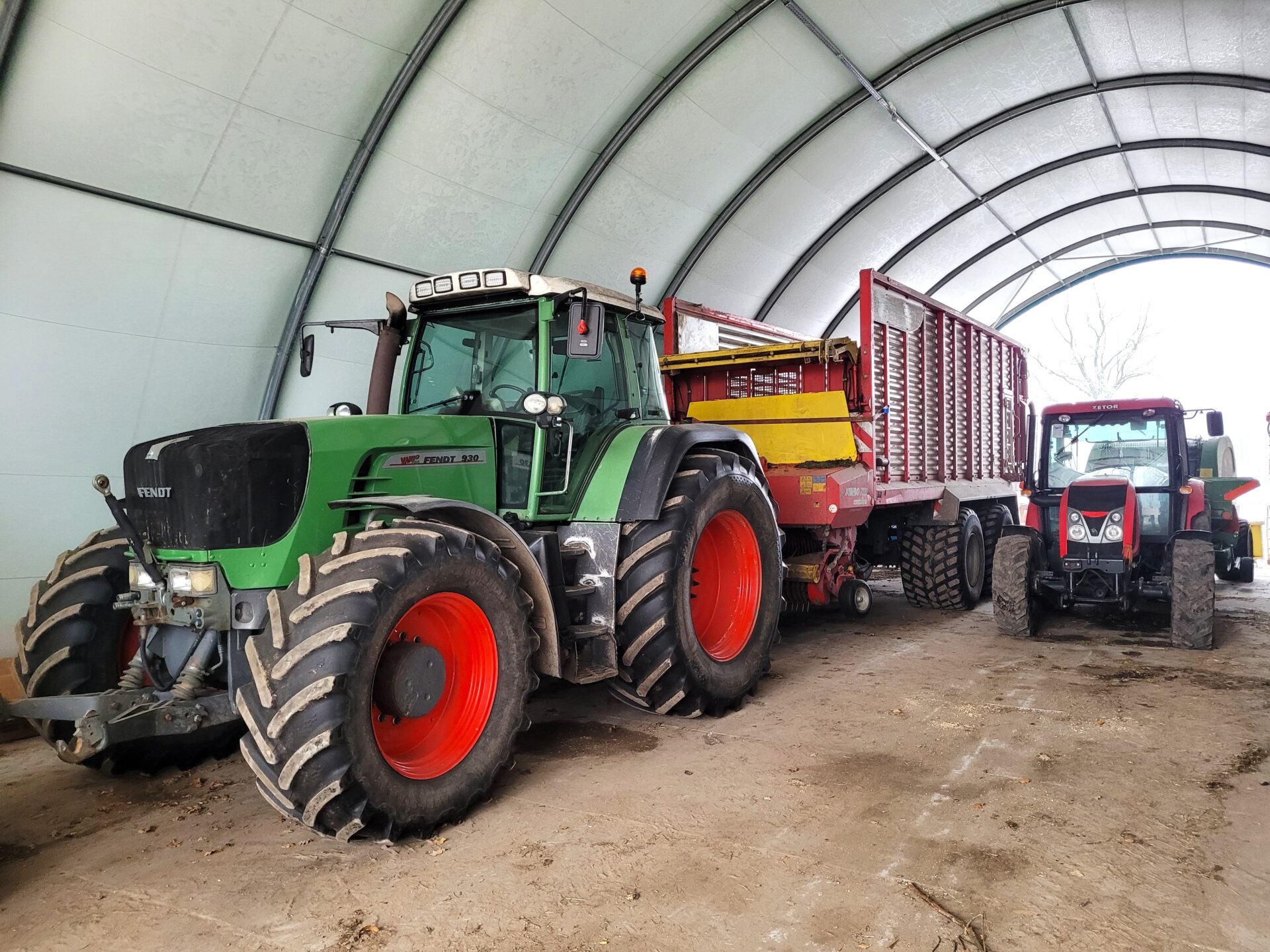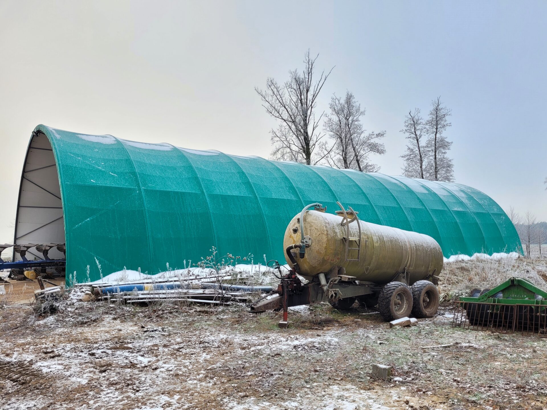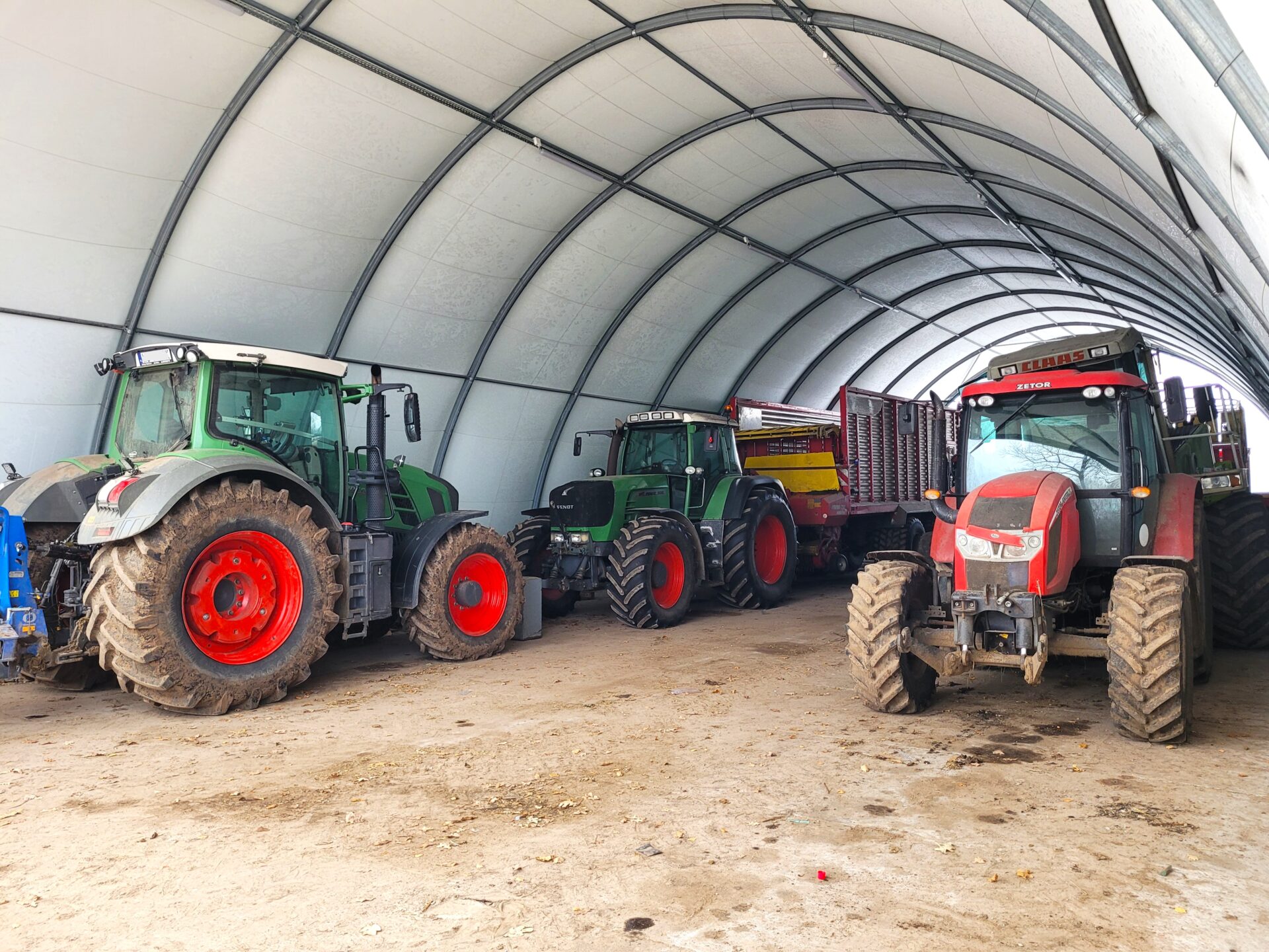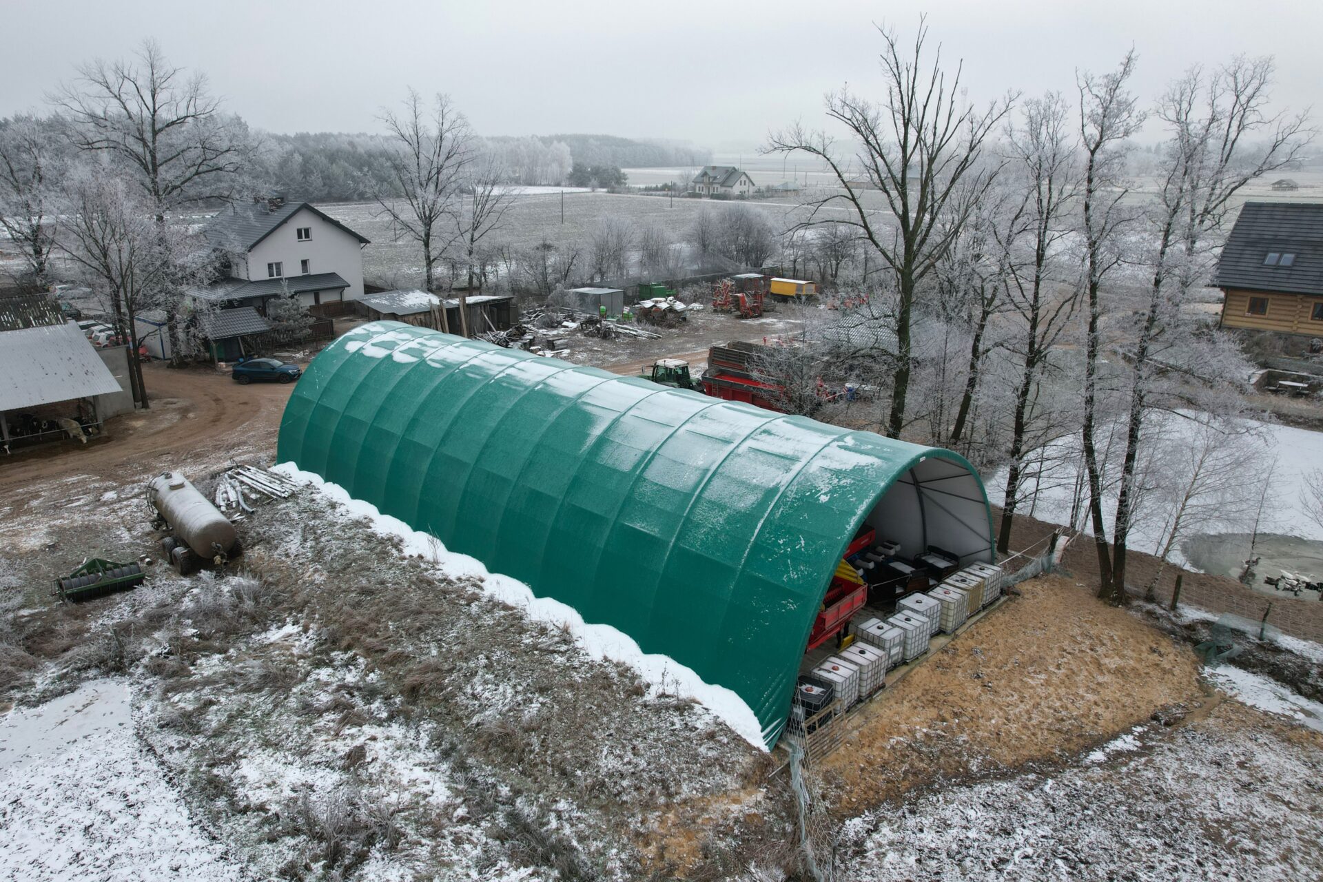 Tym razem przedstawiamy garaż na maszyny rolnicze o następujących parametrach: 12 m szerokości, 30 m długości, 6,45 m wysokości – profil owalny OV130. Hala posadowiona została na wylewce betonowej, końce membrany pokryciowej zostały wpuszczone w grunt.