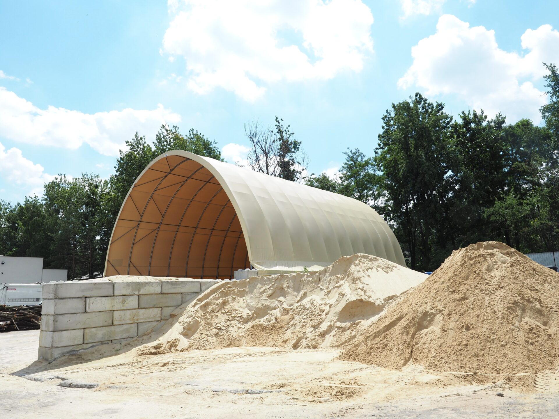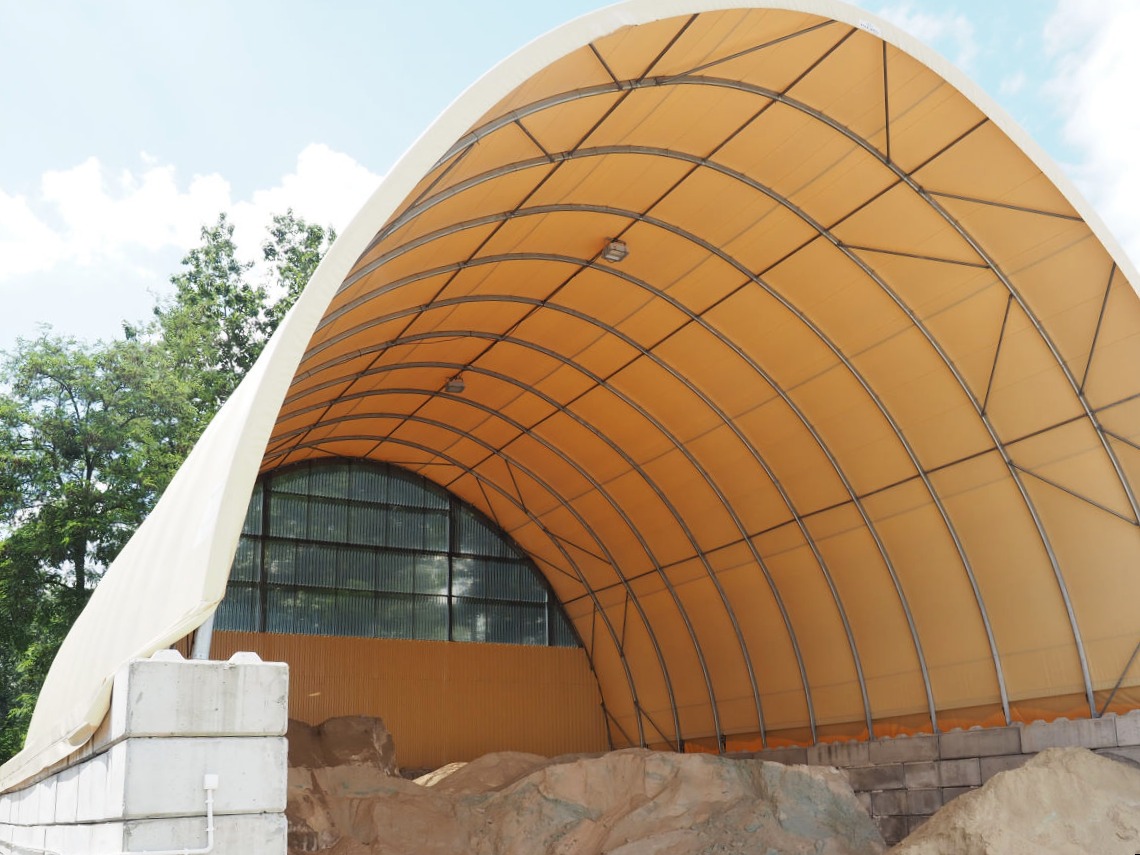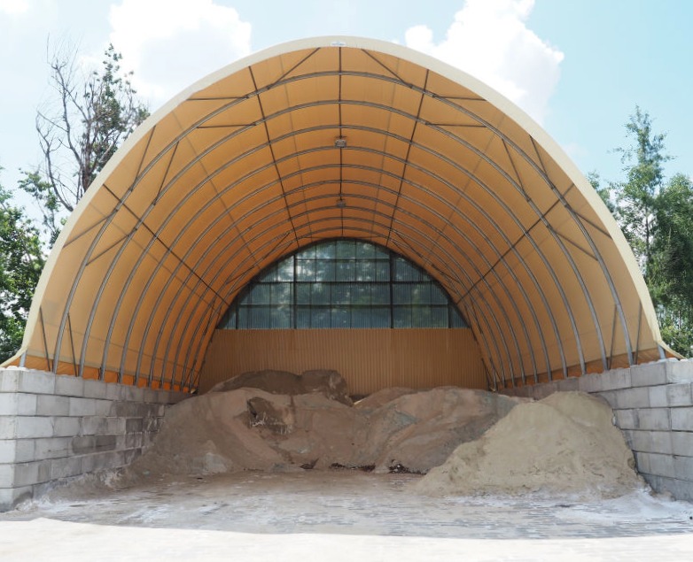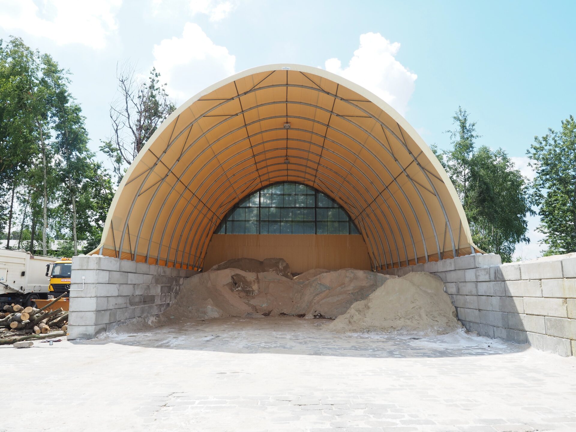 Właścicielem opisywanej realizacji jest wiodąca firma recyklingowa zajmująca się zbiórką i zagospodarowaniem odpadów, a także utrzymaniem ulic i dróg. Klient wykorzystuje halę łukową jako magazyn materiałów sypkich, który jest w stanie pomieścić aż do 500 ton soli drogowej.